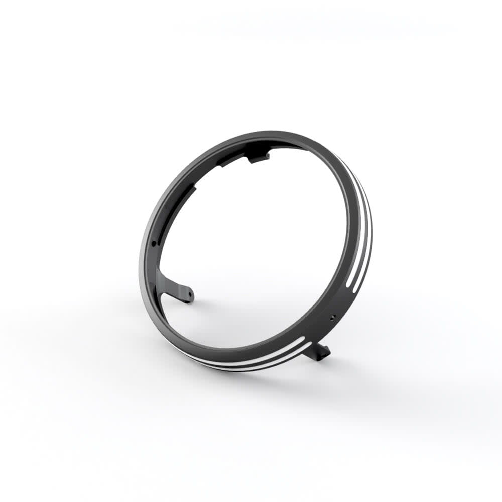 A fully machined aluminium headlight bezel with machined groove detailing anodized in black.